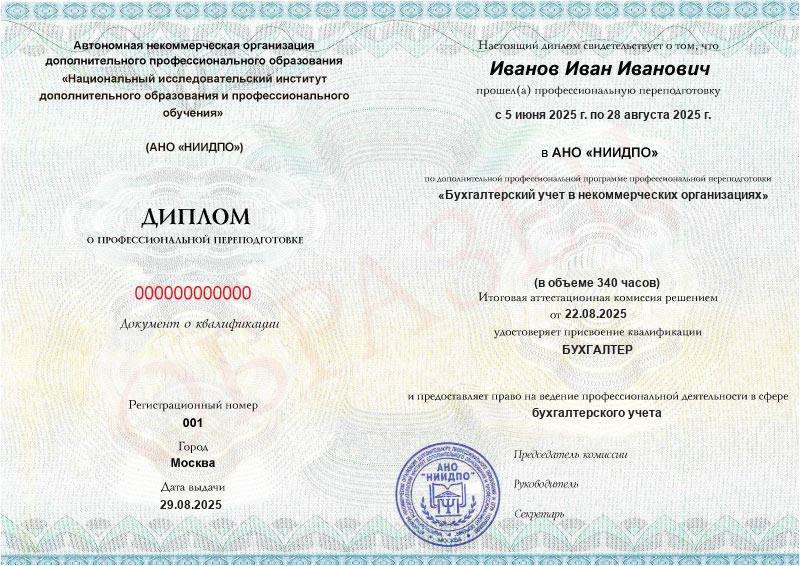 - Получите официальный диплом о профессиональной переподготовке бухгалтера НКО, который дает право работать по новой специальности.