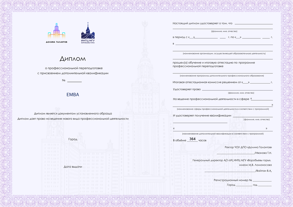 • Завершите обучение с двумя дипломами престижных организаций — АНО «НИИДПО» и ИНТЦ МГУ «Воробьевы горы», удостоверяющими вашу квалификацию.