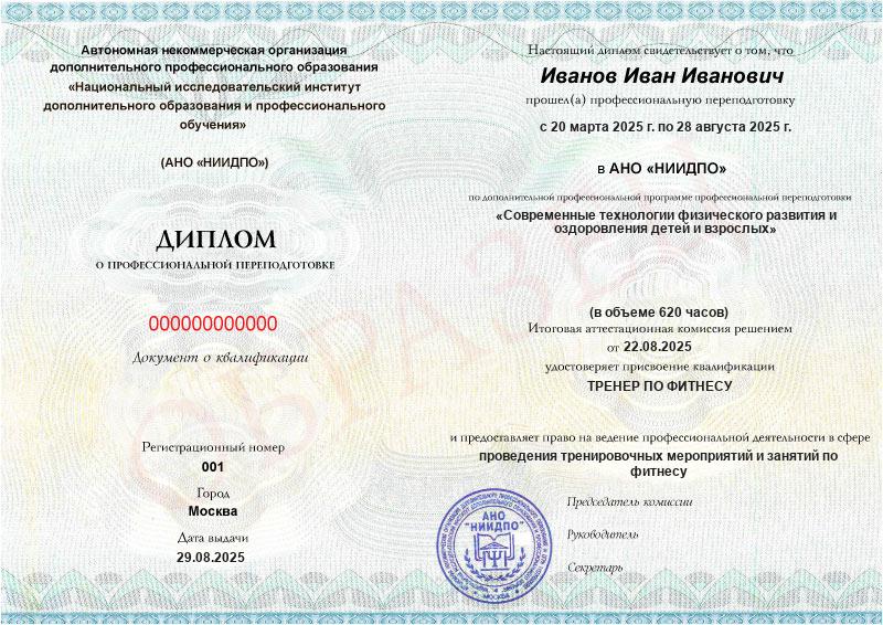 Диплом о профессиональной переподготовке от АНО «НИИПДО»Диплом действует на территории всей России и признается государственными и частными организациями