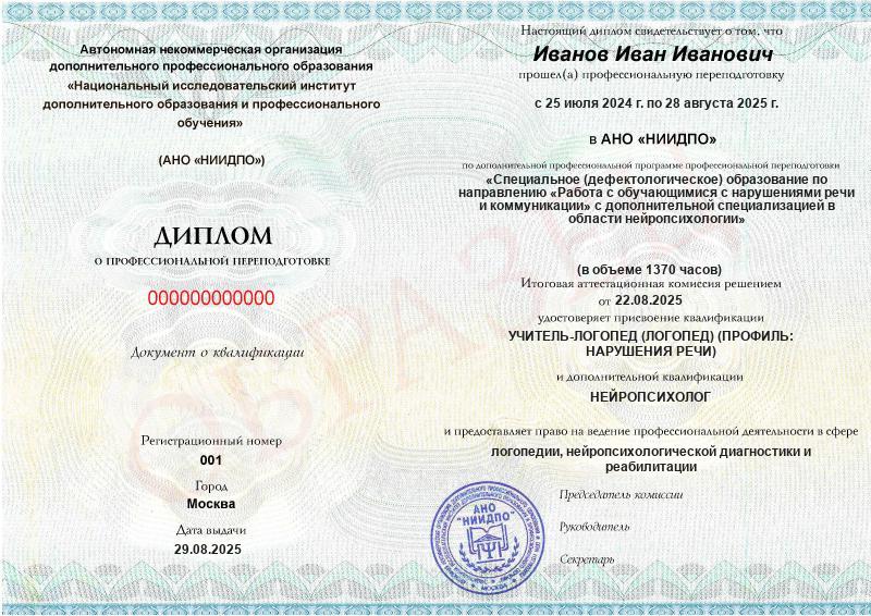 - 2 квалификации: Учитель-логопед (логопед) (профиль: нарушения речи) + Нейропсихолог