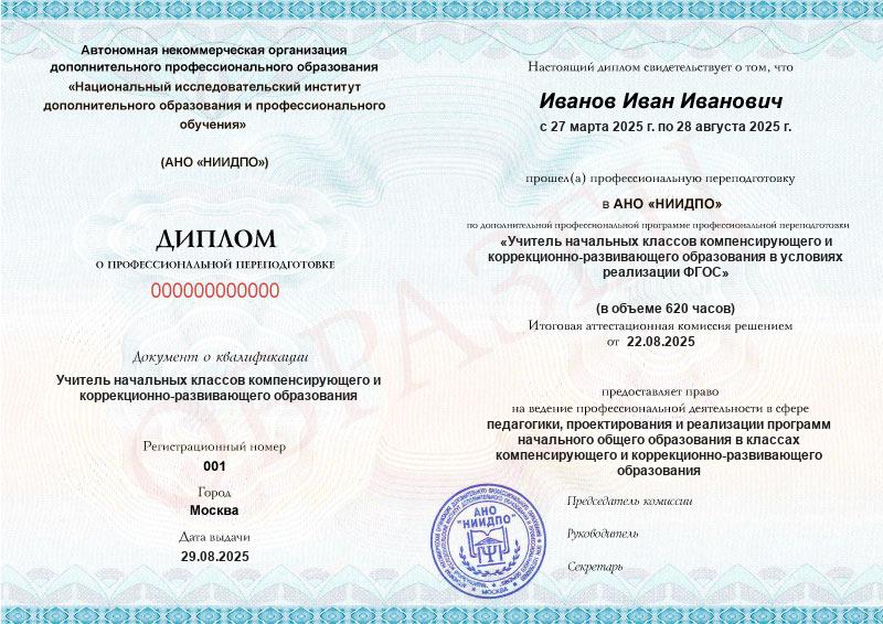 • Диплом о профпереподготовке с присвоением квалификации «Учитель начальных классов компенсирующего и коррекционно-развивающего образования».